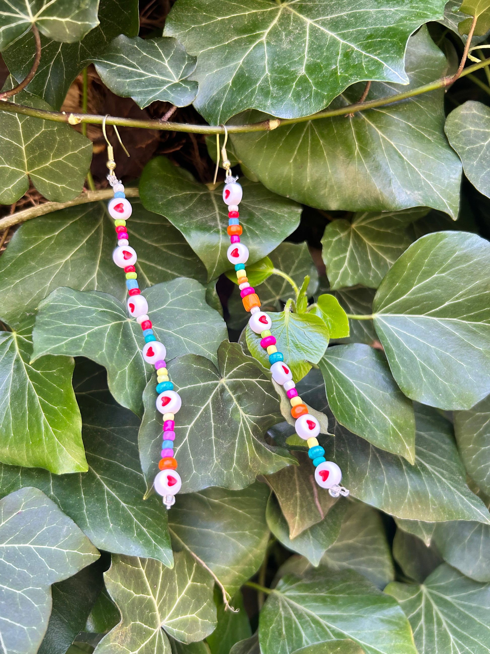 Tiny rainbow beads with hearts strung together as dangly earrings