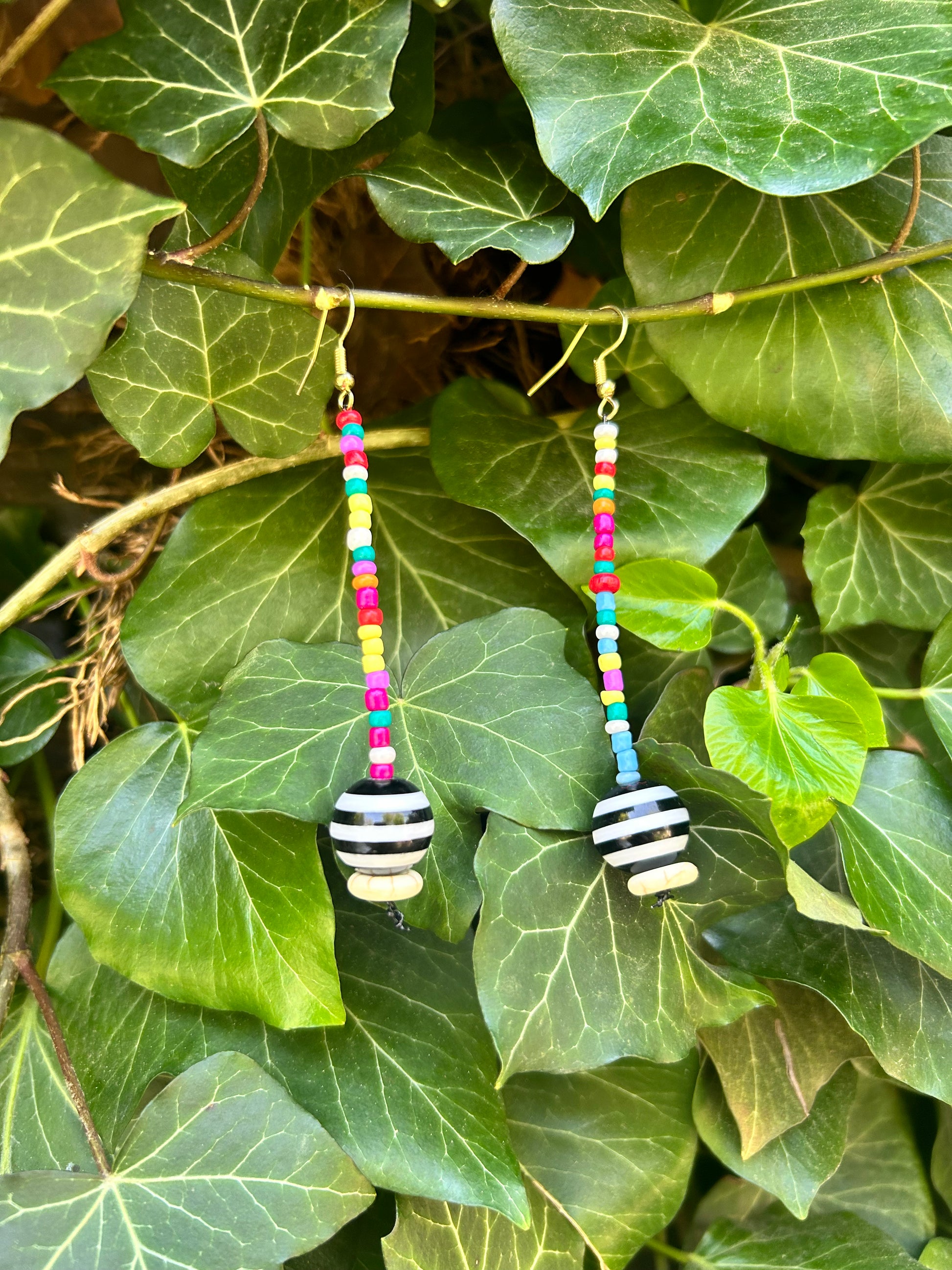 tiny colorful beads dangling with a striped large ceramic bead on the end.