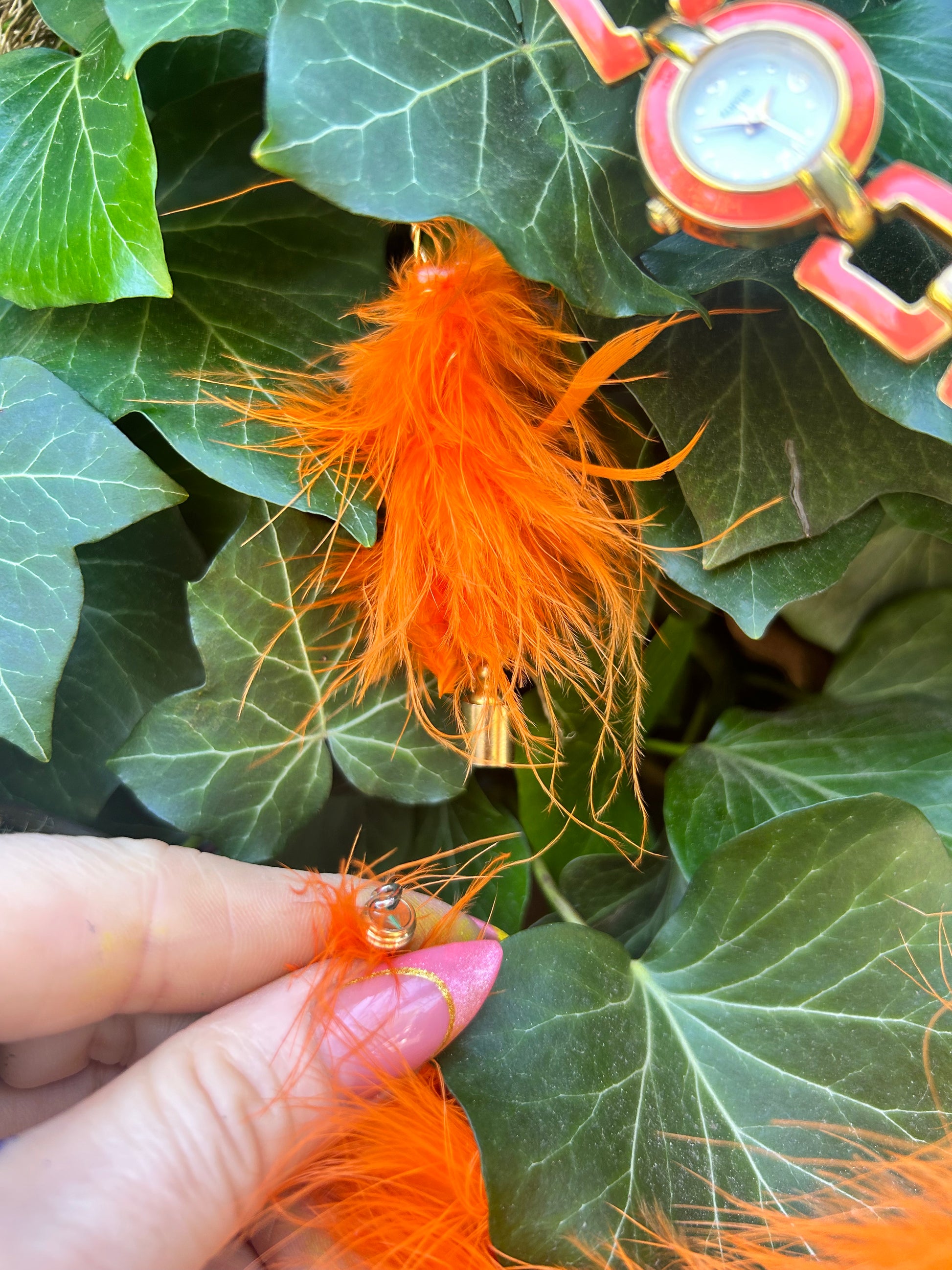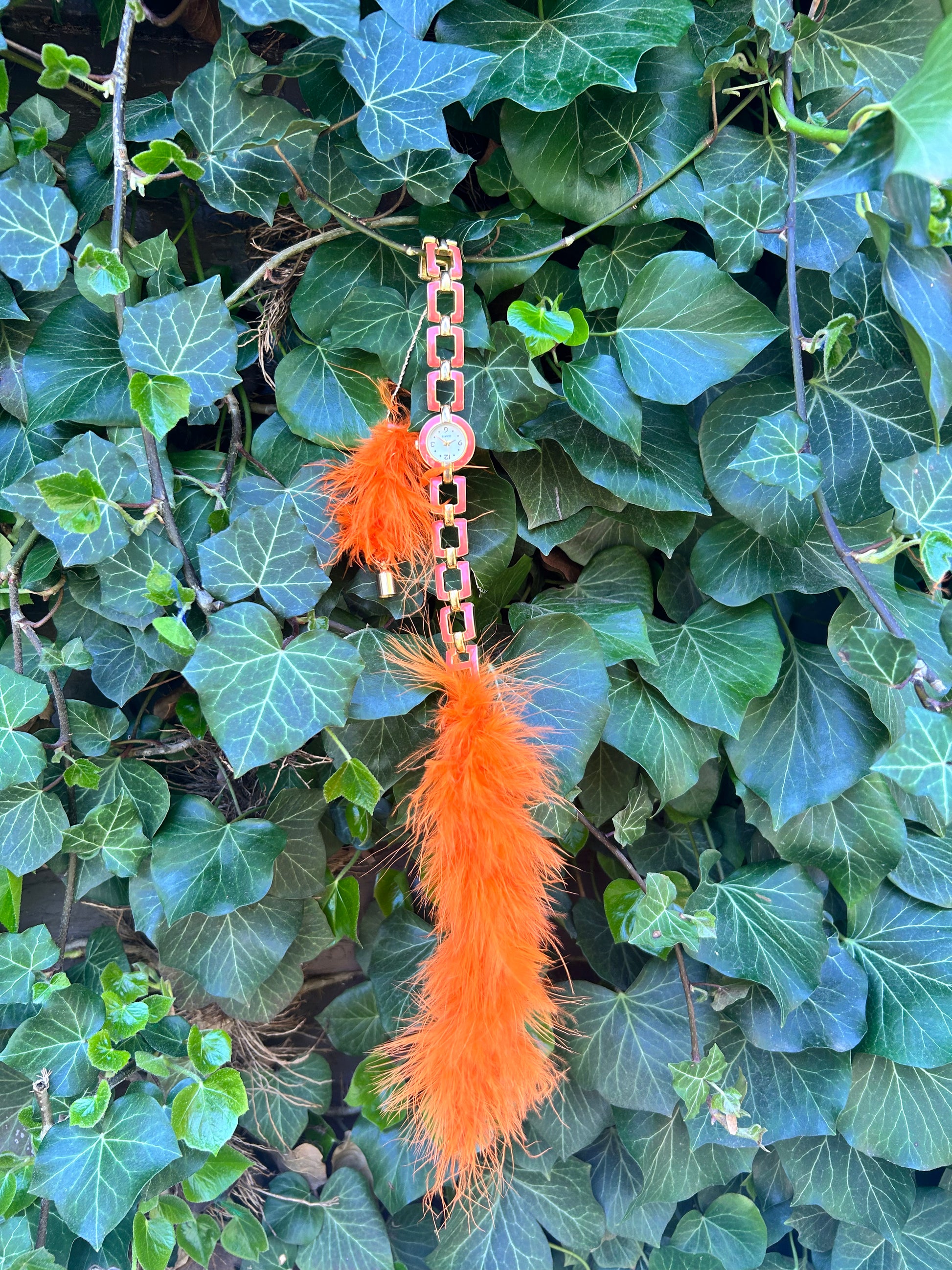 this loose fitting choker is easy to wear and remove with the magnet clasp. its got gold wire and orange feathers it can be worn as a choke or a bracelet or as hair decor.