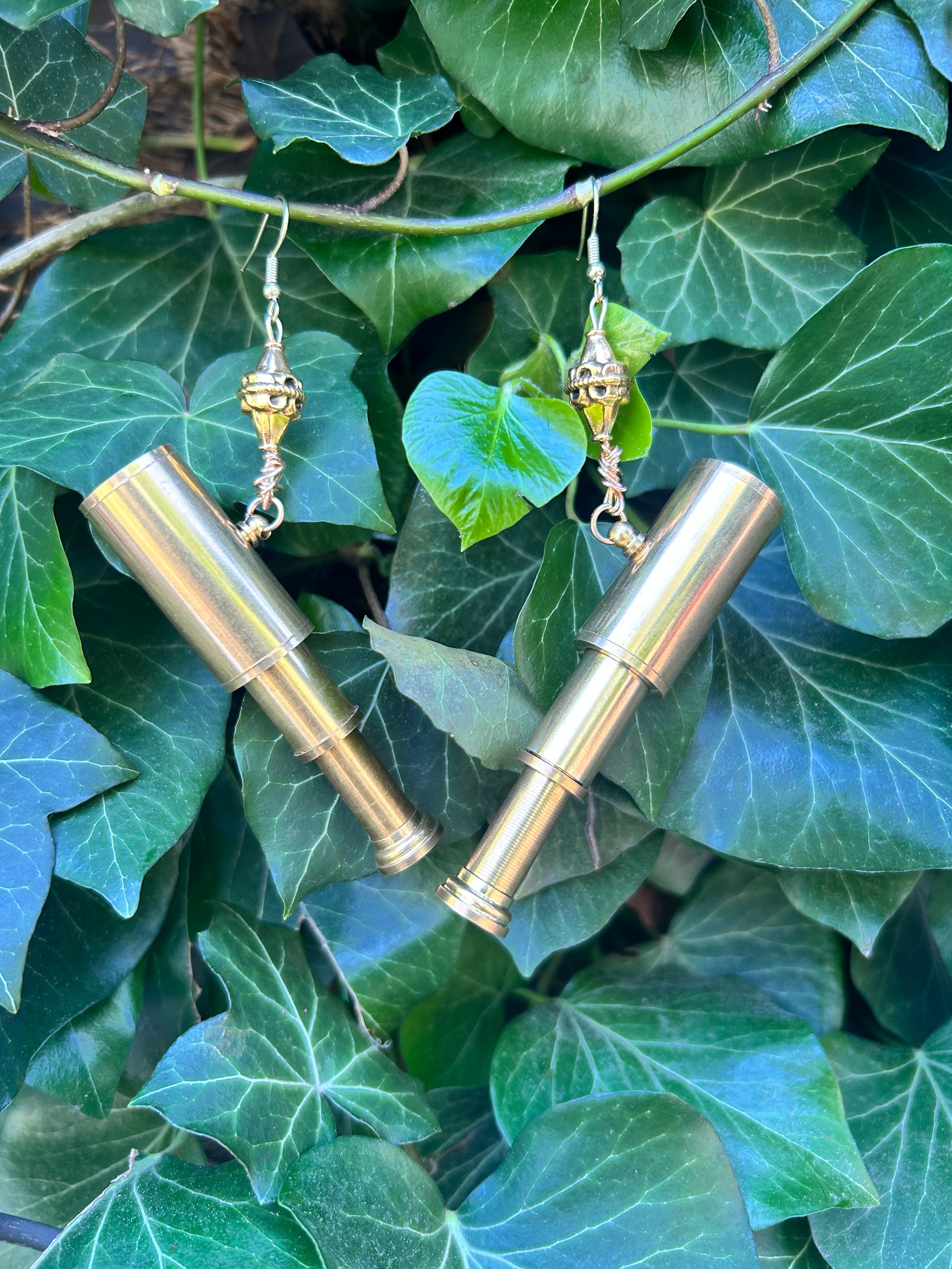 golden telescopes dangling from gold beads