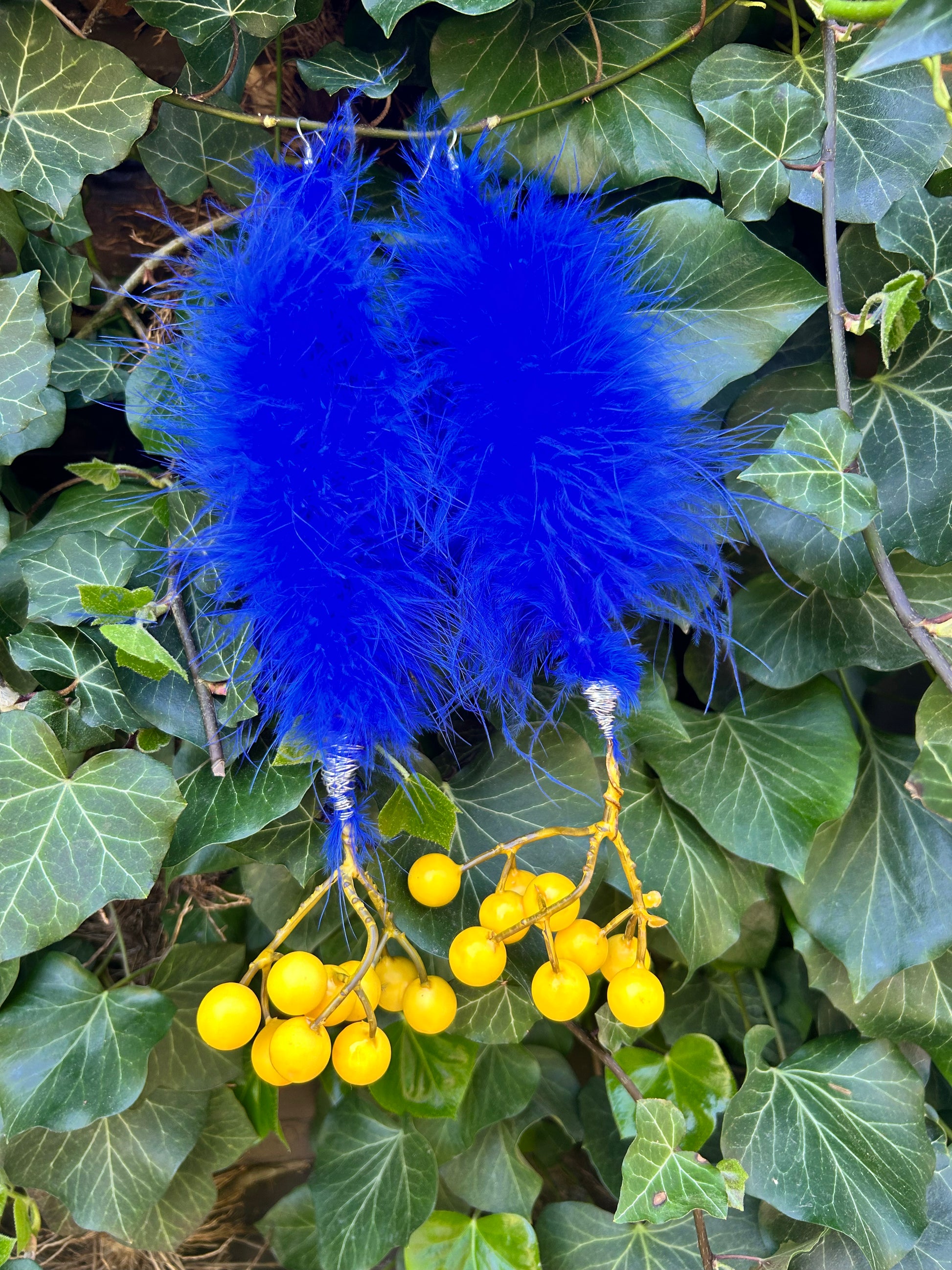 feathery blue dangly earrings with whimsical yellow balls on the end