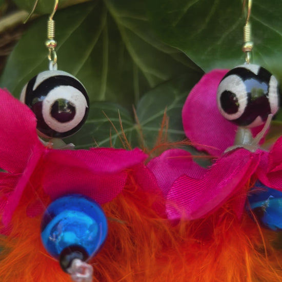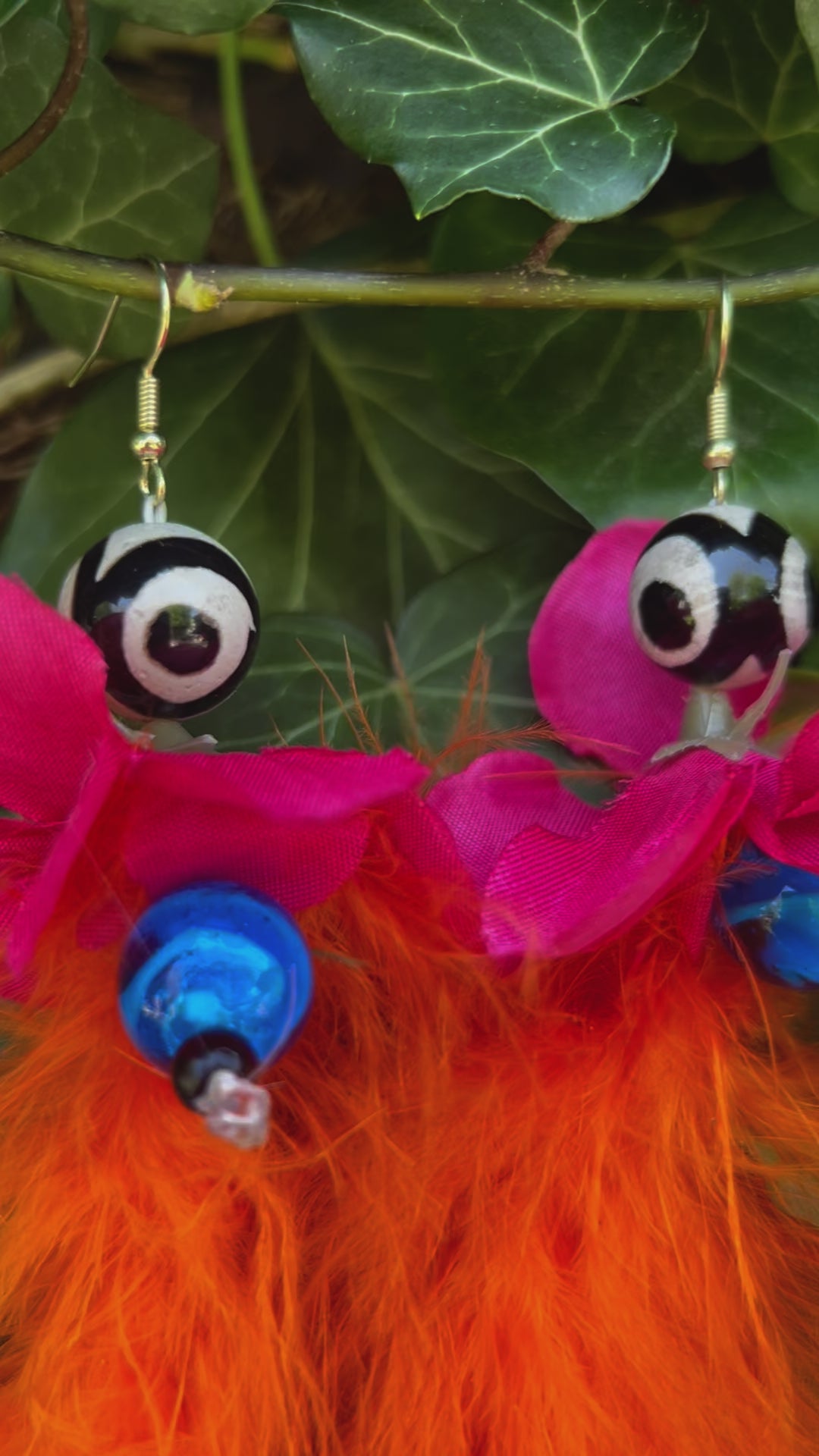 part dream part flower this is by far one of my favorite pieces. orange feathers topped with a pink flower and a blue marble bead to mimic the floral center and a black and white funky bead to really set things off.