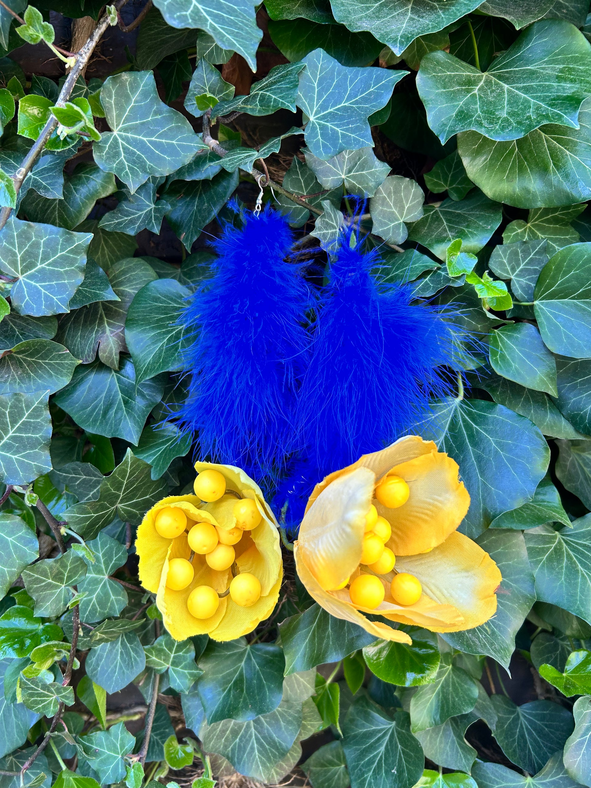 blue feathered rope create a short dangle ear art, wired and attached to a yellow tulip with funky yellow pollen balls inside. why just make art when you can become art also.