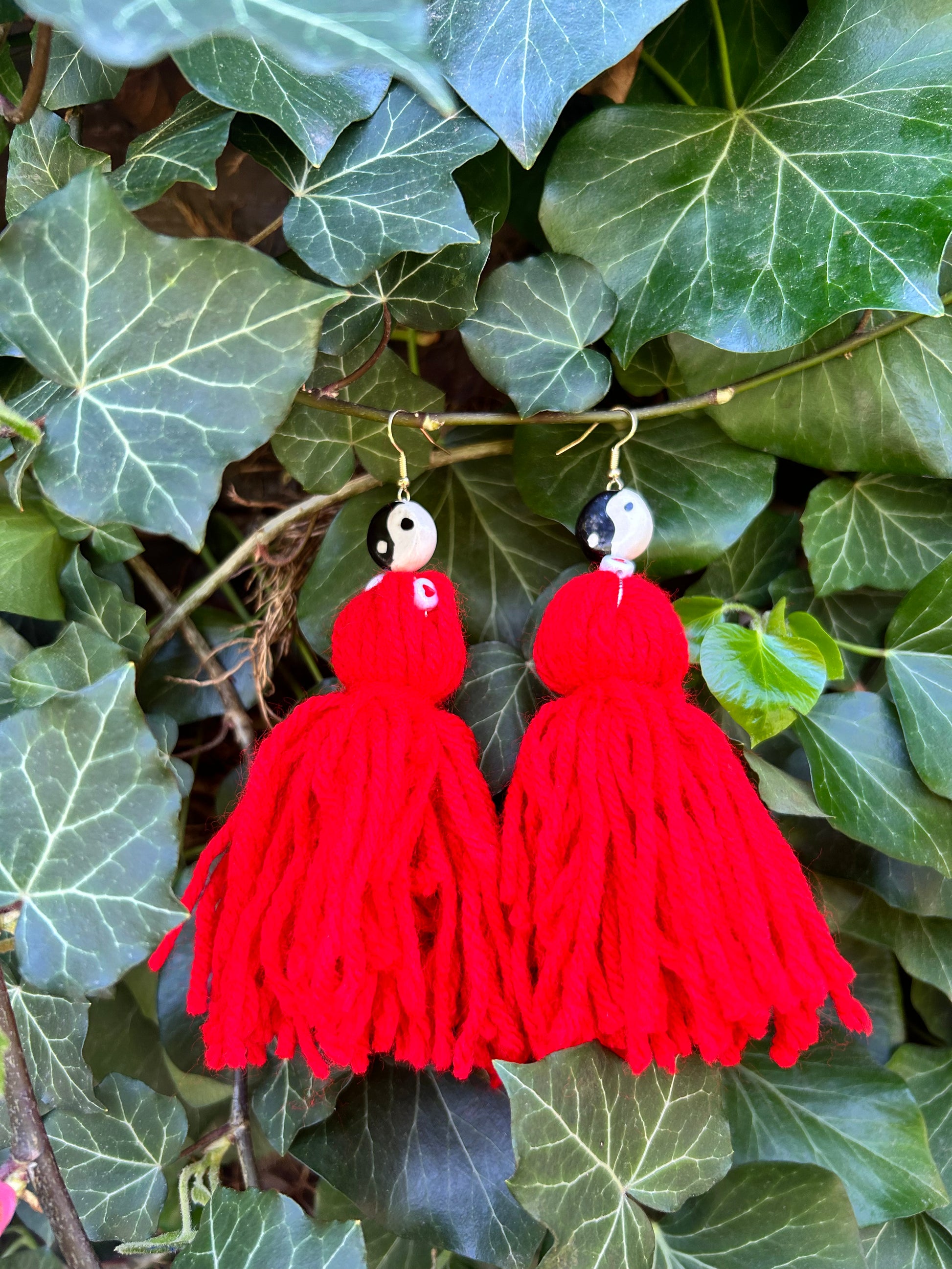 yarn earrings topped with a ceramic yin and yang bead